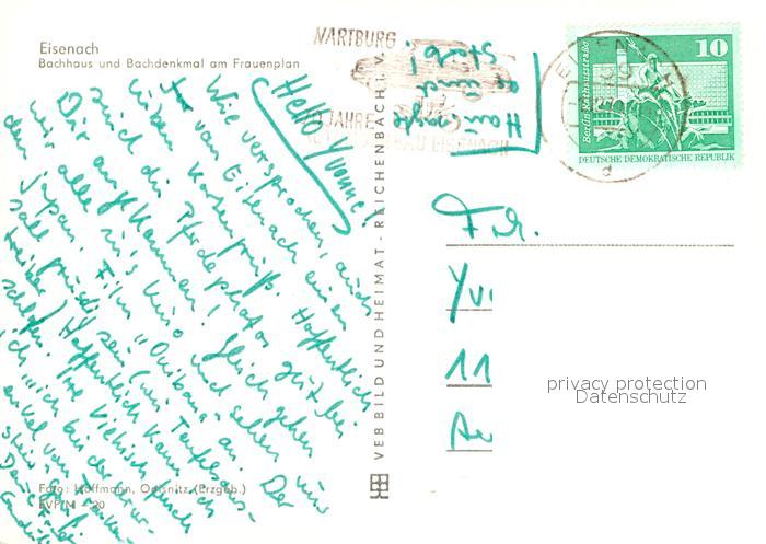 72940441 alte Postkarte Eisenach Thueringen Bachhaus Bachdenkmal am Frauenplan postalisch gelaufen Erhaltung siehe scans [NatalD47] KatCode: 11110016056000