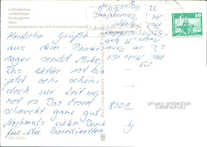72610703 alte Postkarte Eisenach Thueringen Lutherdenkmal Landestheater Kartausgarten Markt Ausstellungspavillon der Autowerke postalisch gelaufen Erhaltung siehe scans [AndreD76] KatCode: 11110016056000