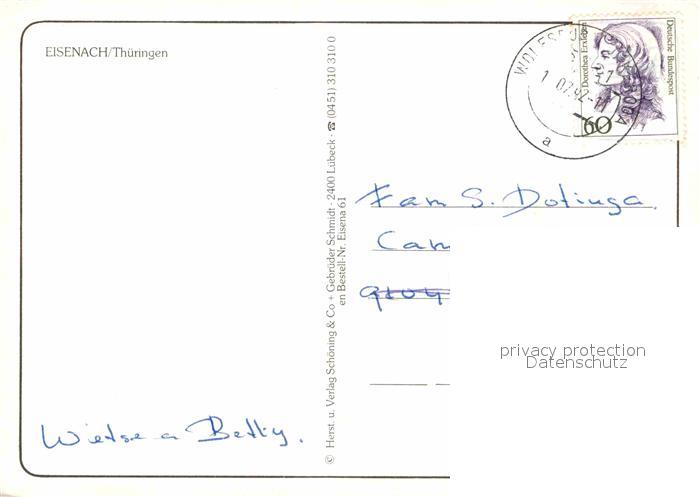 72825014 alte Postkarte Eisenach Thueringen Ratsapotheke Lutherdenkmal Bach-Haus Eselbrunnnen postalisch gelaufen Erhaltung siehe scans [LiesaD40] KatCode: 11110016056000