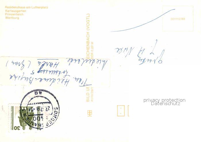 72898012 Eisenach Thueringen Residenzhaus Lutherplatz Kartausgarten Prinzenteich Wartburg postalisch nicht gelaufen Erhaltung siehe scans [FriedD77] KatCode: 11110016056000