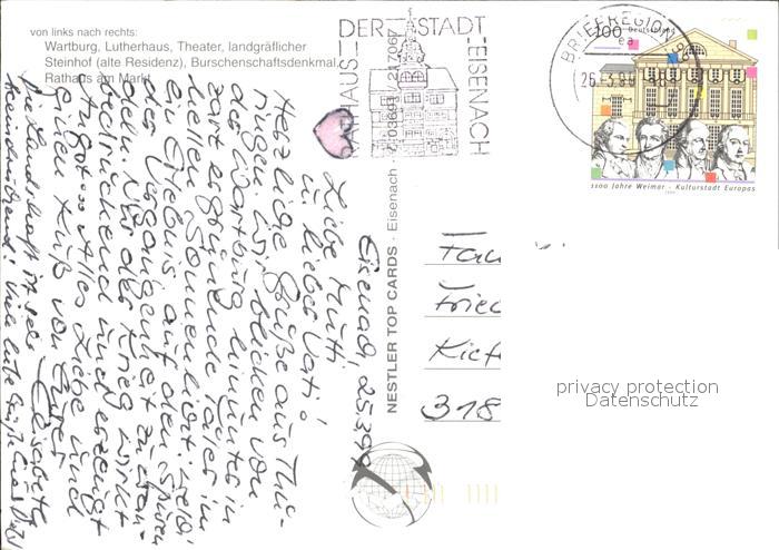 72336988 alte Postkarte Eisenach Thueringen Wartburg Lutherhaus Theater Steinhof Residenz Burschenschaftsdenkmal Rathaus Markt postalisch gelaufen Erhaltung siehe scans KatCode: 11110016056000