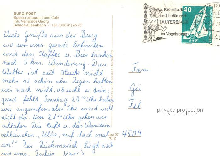73726789 alte Postkarte Eisenbach Lauterbach Gaststaette Pension Burg-Post Restaurant Schloss postalisch gelaufen Erhaltung siehe scans [FriedD77] KatCode: 11110006535011