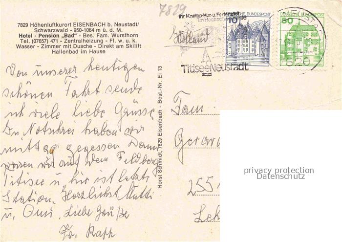 74044756 alte Postkarte Eisenbach Schwarzwald BW Hotel Pension Bad Gastraeume postalisch gelaufen Erhaltung siehe scans [WerneD78] KatCode: 11110008315031