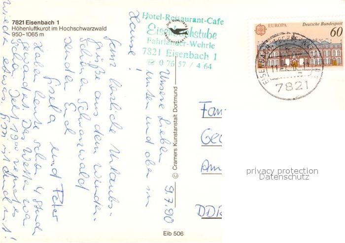 73089167 alte Postkarte Eisenbach Schwarzwald Hotel Bad St. Benedikt Eisenbachstube postalisch gelaufen Erhaltung siehe scans [NatalD47] KatCode: 11110008315031