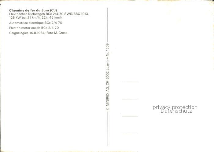 Eisenbahn Chemins de Fer du Jura Elektrischer Triebwagen BCe 2/4 70 postalisch nicht gelaufen Erhaltung siehe scans [PaolaD17]