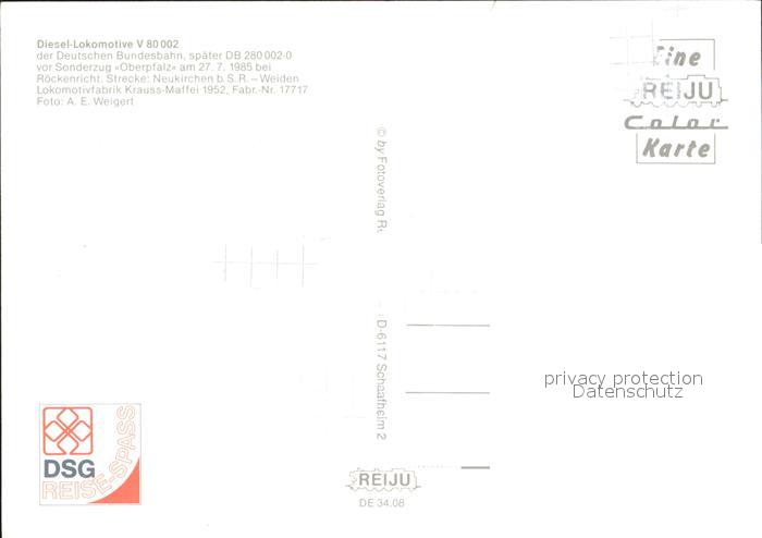 Eisenbahn Diesel-Lokomotive V 80-002 Sonderzug Oberpfalz Roeckenricht postalisch nicht gelaufen Erhaltung siehe scans