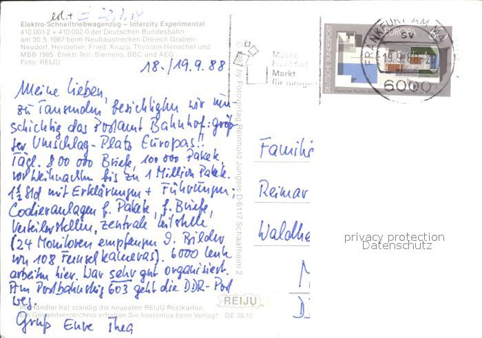 alte Postkarte Eisenbahn Elektro-Schnelltriebwagenzug Intercity Experimental postalisch gelaufen Erhaltung siehe scans
