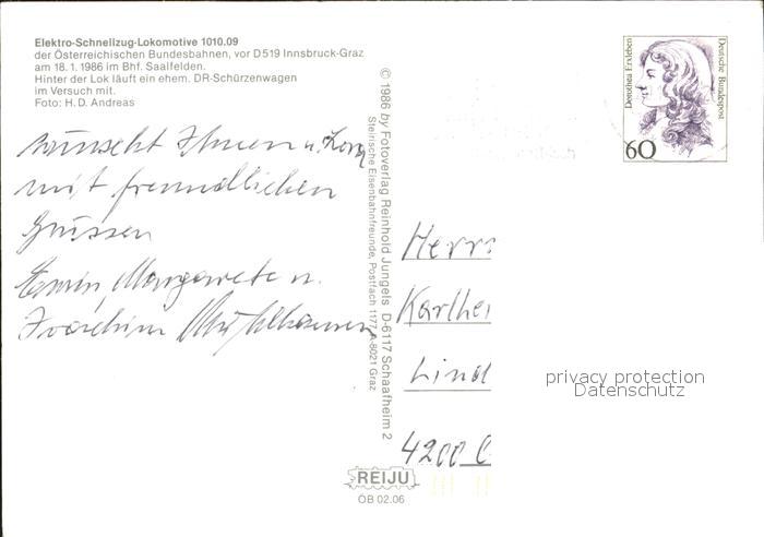 alte Postkarte Eisenbahn Elektro-Schnellzug-Lokomotive 1010.09 postalisch gelaufen Erhaltung siehe scans