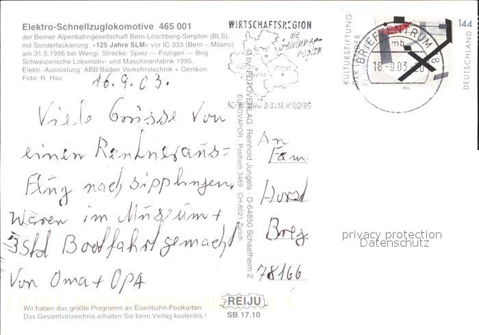 alte Postkarte Eisenbahn Elektro-Schnellzuglokomotive 465 001 Berner Alpenbahngesellschaft postalisch gelaufen Erhaltung siehe scans