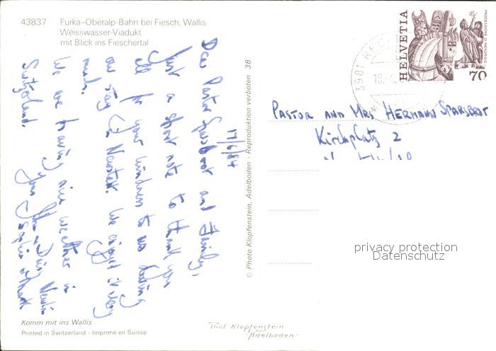 alte Postkarte Eisenbahn Furka-Oberalp-Bahn Fiesch Weisswasser-Viadukt Fieschertal postalisch gelaufen Erhaltung siehe scans