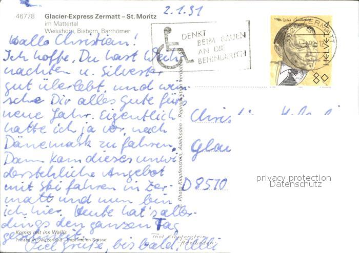 alte Postkarte Eisenbahn Glacier-Express Zermatt-St. Moritz Mattertal Weisshorn Bishorn postalisch gelaufen Erhaltung siehe scans