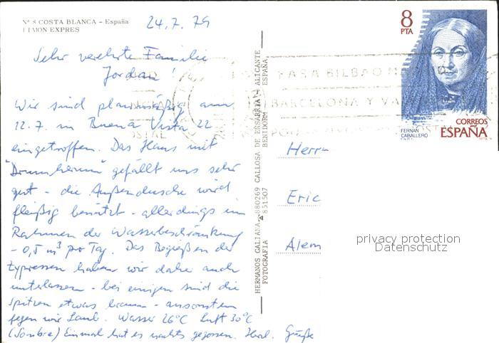 alte Postkarte Eisenbahn Limon Expres Costa Blanca postalisch gelaufen