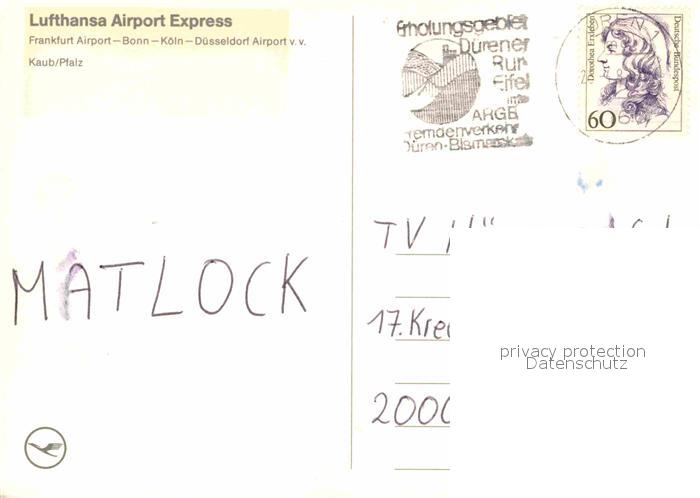 alte Postkarte Eisenbahn Lufthansa Airport Express Kaub Pfalz postalisch gelaufen Erhaltung siehe scans [PaolaD17]