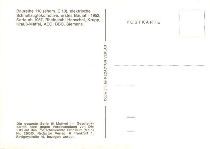 73928108 Eisenbahn Railway Chemin de Fer Baureihe 110 elektrischer Schnellzuglokomotive Baujahr 1952 postalisch nicht gelaufen Erhaltung siehe scans [IrynaD87] KatCode: 22040000000300