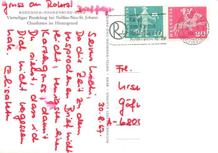 74027833 alte Postkarte Eisenbahn Railway Chemin de Fer Bodensee Togenburg Nesslau Neu St. Johann postalisch gelaufen Erhaltung siehe scans [IrynaD87] KatCode: 22040000000300