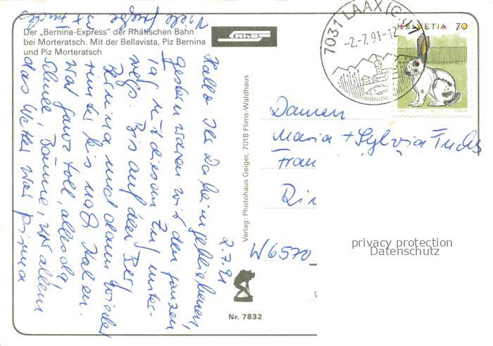 74137922 alte Postkarte Eisenbahn Railway Chemin de Fer Ferrovia– Bernina Eypress Rhaetische Bahn Morteratsch Bellavista postalisch gelaufen Erhaltung siehe scans [SanaeD93] KatCode: 22040000000300