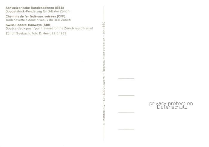 73900880 Eisenbahn Railway Chemin de Fer SBB Doppelstock Pendelzug S-Bahn Zuerich postalisch nicht gelaufen Erhaltung siehe scans [IrynaD87] KatCode: 22040000000300