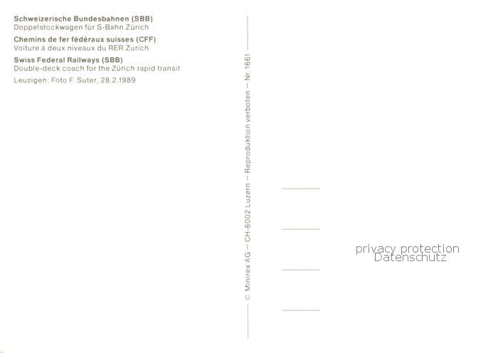 73900879 Eisenbahn Railway Chemin de Fer SBB Doppelstockwagen S-Bahn Zuerich postalisch nicht gelaufen Erhaltung siehe scans [IrynaD87] KatCode: 22040000000300