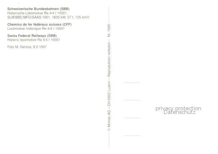 73900889 Eisenbahn Railway Chemin de Fer SBB Lokomotive Re 4/4 I 10001 postalisch nicht gelaufen Erhaltung siehe scans [IrynaD87] KatCode: 22040000000300