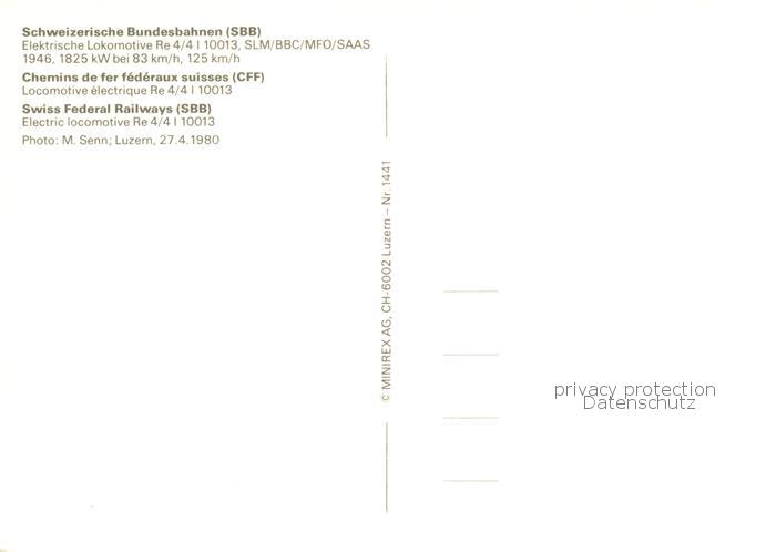 73900892 Eisenbahn Railway Chemin de Fer SBB Lokomotive Re 4/4 I 10013 postalisch nicht gelaufen Erhaltung siehe scans [IrynaD87] KatCode: 22040000000300