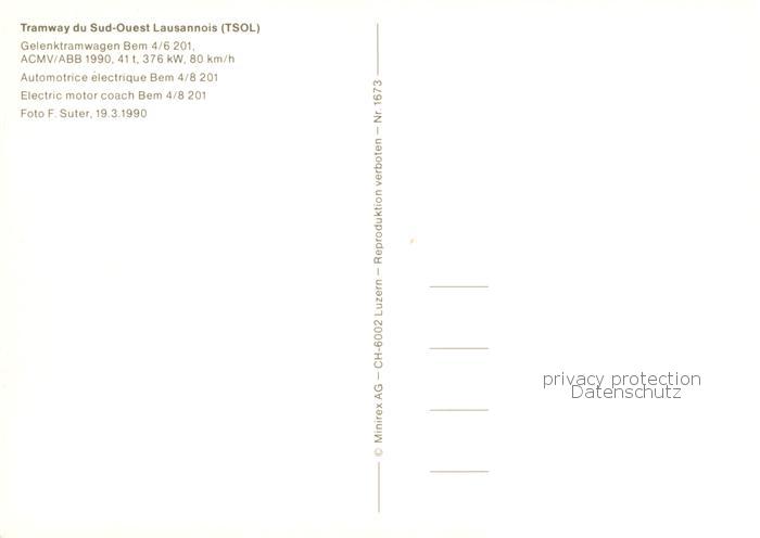 73900878 Eisenbahn Railway Chemin de Fer Tramway du Sud ouest Lausannois TSOL Bem 4/6 201 postalisch nicht gelaufen Erhaltung siehe scans [IrynaD87] KatCode: 22040000000300