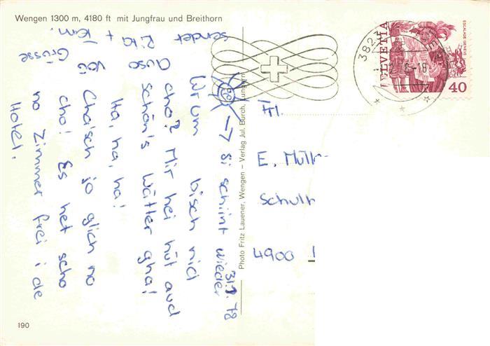 74026058 alte Postkarte Eisenbahn Railway Chemin de Fer Wengen Jungfrau Breithorn Schweiz postalisch gelaufen Erhaltung siehe scans [SanaeD93] KatCode: 22040000000300