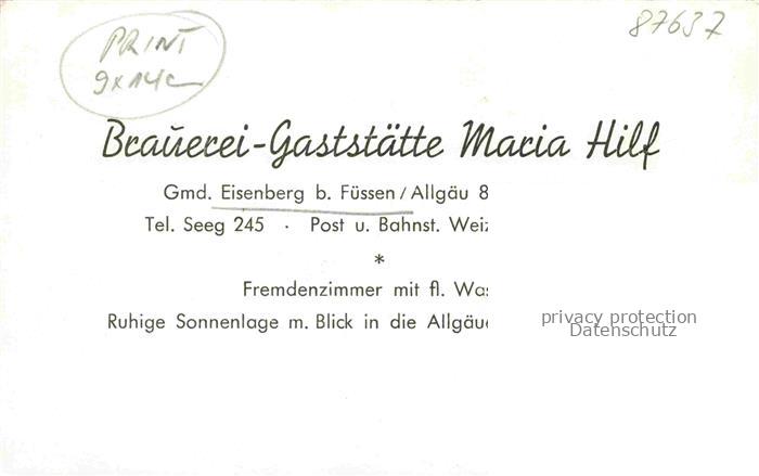 74096134 Eisenberg Fuessen Bayern Brauerei Gaststaette Maria Hilf Allgaeu postalisch nicht gelaufen Keine Postkarte (siehe scan) Erhaltung siehe scans [IrynaD87] KatCode: 11110009777129
