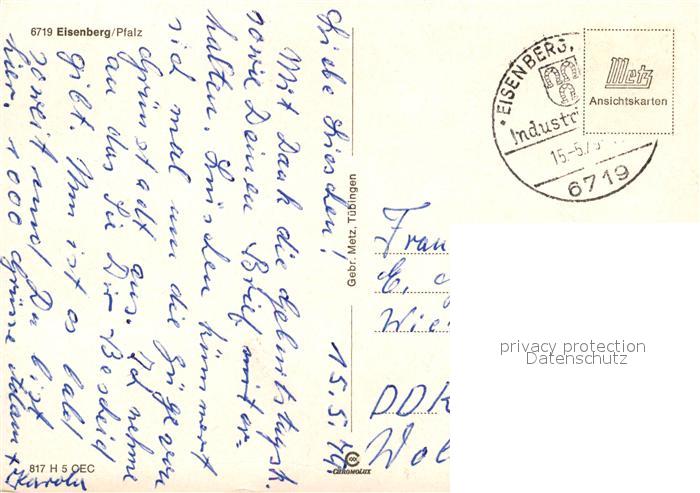 73182666 alte Postkarte Eisenberg Pfalz Denkmal Freibad Ortsansicht mit Kirche Geschichte postalisch gelaufen Erhaltung siehe scans [FriedD77] KatCode: 11110007333019