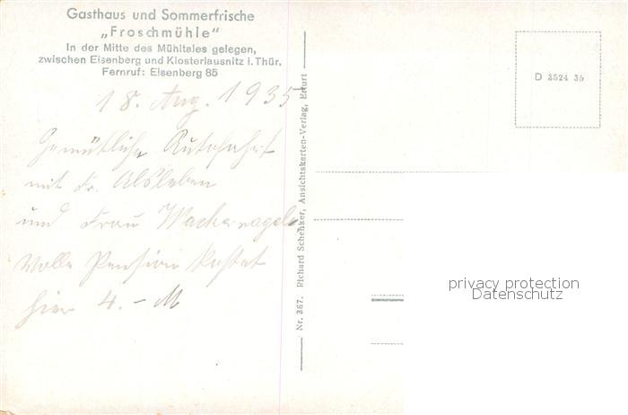 73771100 Eisenberg Thueringen Meuschkensmuehle Neupoldsmuehle Froschmuehle Pfarrmuehle Muehltal Walkmuehle Amtsschreibermuehle Robertsmuehle Waldschloesschen postalisch nicht gelaufen Erhaltung siehe scans [WerneD78] KatCode: 11110016074018