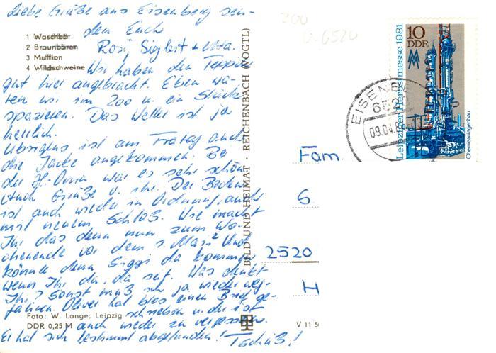 73927252 Eisenberg Thueringen Tiergarten Eisenberg Waschbaer Braunbaeren Mufflon Wildschweine postalisch gelaufen Erhaltung siehe scans [WerneD78] alte Postkarte Wern Katcode 11110016074018