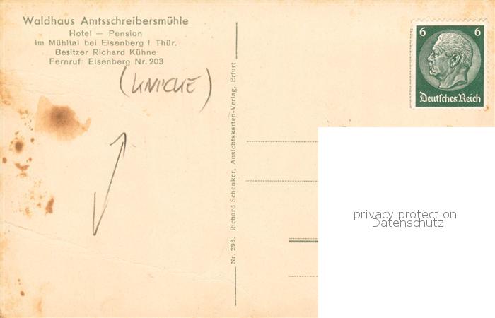 73841540 alte Postkarte Eisenberg Thueringen Waldhaus Amtsschreibermuehle im Muehltal postalisch gelaufen Erhaltung siehe scans [FriedD77] KatCode: 11110016074018