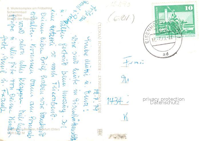 73574293 alte Postkarte Eisenhuettenstadt 6. Wohnkomplex am Froebelring Schwimmbad Leninallee Strasse der Republik postalisch gelaufen Erhaltung siehe scans [FriedD77] KatCode: 11110012067120