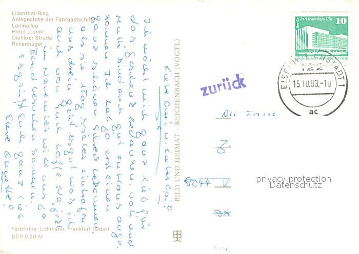 73615537 alte Postkarte Eisenhuettenstadt Lilienthal Ring Schiffsanlegestelle Leninallee Hotel Lunik Diehloer Str Rosenhuegel postalisch gelaufen Erhaltung siehe scans [WerneD78] KatCode: 11110012067120