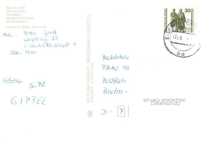 73656114 alte Postkarte Eisenhuettenstadt Platz der DSF Schwimmhalle Leninallee Strasse der Republik Wohnkomplex 6 postalisch gelaufen Erhaltung siehe scans [FriedD77] KatCode: 11110012067120