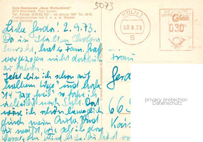 73863261 Eisenkaul Kuerten Cafe Restaurant Haus Wollersheim Wildgehege postalisch gelaufen Erhaltung siehe scans [FriedD77] alte Postkarte Frie Katcode 11110005315000