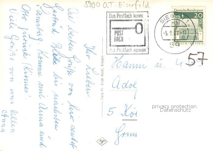 73710305 alte Postkarte Eiserfeld Siegen Eisernstrasse Teilansicht v. Ortsmitte Hungs- u. Pfannenberg postalisch gelaufen Erhaltung siehe scans [LiesaD40] KatCode: 11110005970040