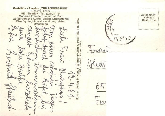 73872446 alte Postkarte Eiserfey Gaststaette Pension zur Roemerstube postalisch gelaufen Erhaltung siehe scans [FriedD77] KatCode: 11110005366028