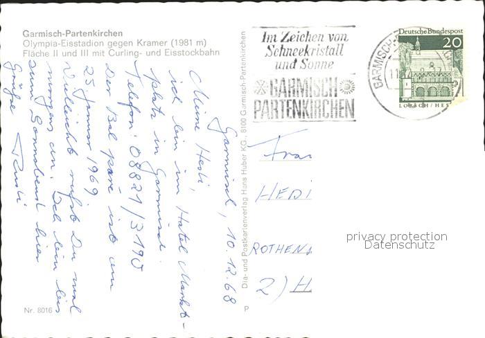 alte Postkarte Eislaufen Schlittschuhlaufen Olympia-Eisstadion Garmisch-Partenkirchen Kramer Curlingbahn postalisch gelaufen Erhaltung siehe scans