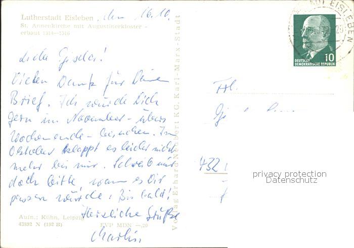 72075093 alte Postkarte Eisleben St. Annenkirche mit Augustinerkloster postalisch gelaufen Erhaltung siehe scans KatCode: 11110015087130