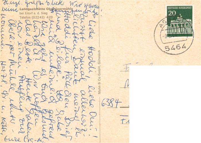 73897143 alte Postkarte Eitorf Landgaststaette Obereipermuehle Gastraeume postalisch gelaufen Erhaltung siehe scans [WerneD78] KatCode: 11110005382016