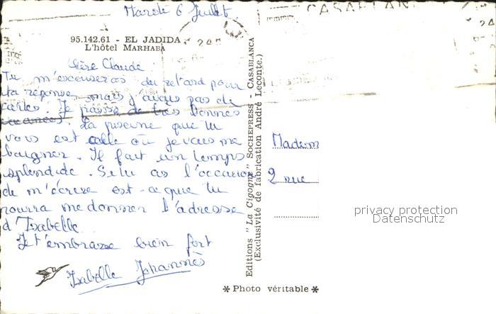 alte Postkarte El Jadida Hotel Marhaba postalisch gelaufen Erhaltung siehe scans