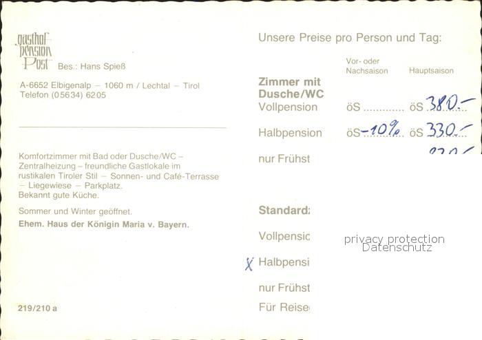 71909663 Elbigenalp Hotel Gasthof Post postalisch nicht gelaufen Werbekarte (keine Postkarte) Erhaltung siehe scans KatCode: 11390331070808