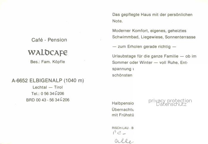 72888053 Elbigenalp WaldCafe postalisch nicht gelaufen Werbekarte (keine Postkarte) Erhaltung siehe scans [AndreD76] KatCode: 11390331070808