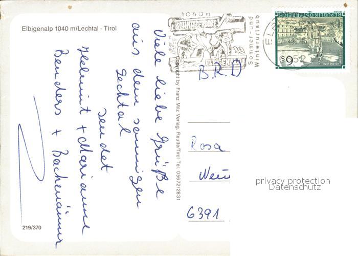 72450754 alte Postkarte Elbigenalp Wetterspitze Sonnenkogeln Griesstalerspitze Pimig Laerchspitze postalisch gelaufen Erhaltung siehe scans KatCode: 11390331070808