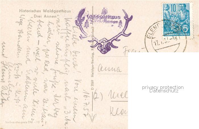 73750034 alte Postkarte Elend Harz Historisches Waldgasthaus Drei Annen postalisch gelaufen Erhaltung siehe scans [FriedD77] KatCode: 11110015085105