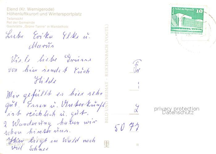 72929803 alte Postkarte Elend Harz Teilansicht Rat der Gemeinde Gaststaette Gruene Tanne Mandelholz postalisch gelaufen Erhaltung siehe scans [WerneD78] KatCode: 11110015085105