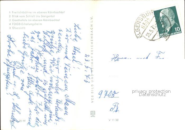72335144 alte Postkarte Elgersburg Freilichtbuehne Schlossblick Goethefels Koernbachtal FDGB Erholungsheim uebersicht postalisch gelaufen Erhaltung siehe scans KatCode: 11110016070011
