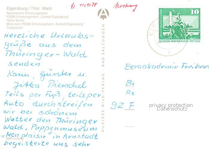 73041088 alte Postkarte Elgersburg Reichsbahn Erholungsheim FDGB Erholungsheim Schloss Elgersburg Hohe Warte Panorama postalisch gelaufen Erhaltung siehe scans [WerneD78] KatCode: 11110016070011