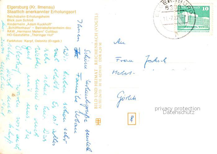 73871044 alte Postkarte Elgersburg Reichsbahn Erholungsheim Schloss Kinderheim Adam Kuckhoff Schoeffenhaus HO Gaststaette Thueringer Hof postalisch gelaufen Erhaltung siehe scans [WerneD78] KatCode: 11110016070011