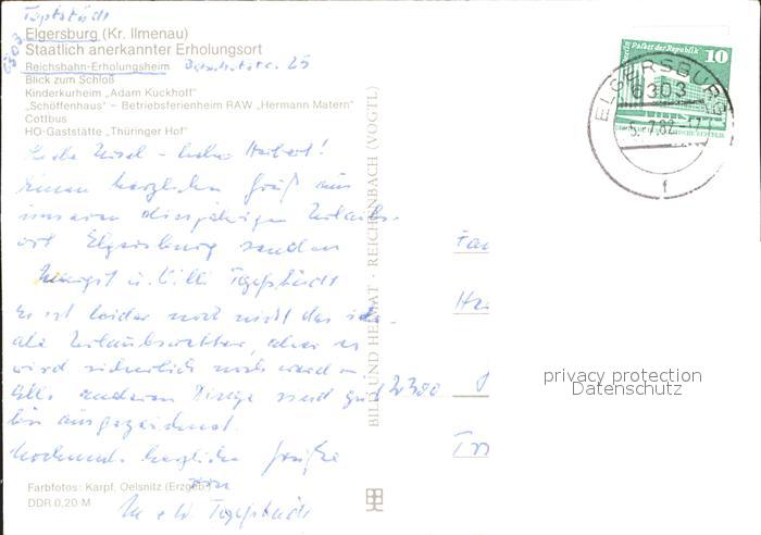 72314802 alte Postkarte Elgersburg Reichsbahn Erholungsheim Schloss Kinderkurheim Adam Kuckhoff Schoeffenhaus Cottbus HOG Thueringer Hof postalisch gelaufen Erhaltung siehe scans KatCode: 11110016070011